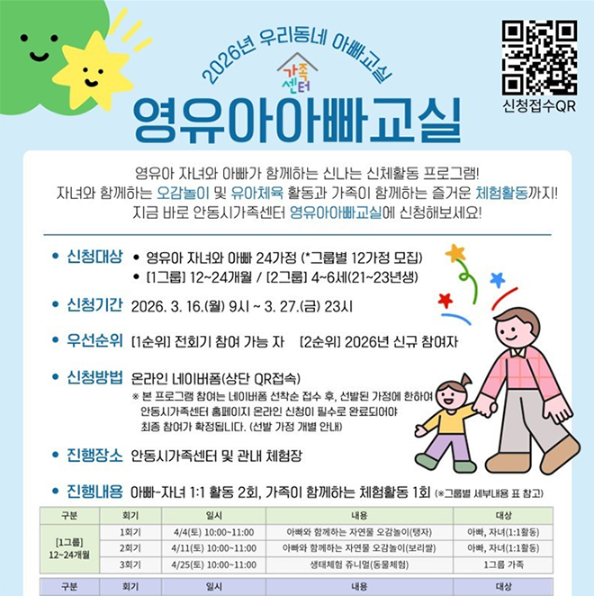 ‘2026년 우리동네 아빠교실, 영유아 아빠교실 프로그램’은 영유아 자녀와 아빠가 함께하는 신나는 신체활동이며 자녀와 함께하는 오감 놀이 및 유아체육 활동과 가족이 함께하는 즐거운 체험활동으로 구성되어 있다. 진행장소는 안동시가족센터 및 관내 체험장이며, 진행 내용은 아빠-자녀 1:1 활동 2회, 가족이 함께하는 체험활동 1회로 구성되어 있다.